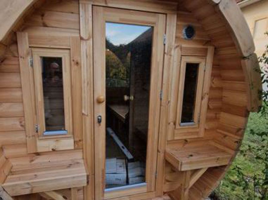 Glasfront bei allen Saunafässern mit 60 cm Terrasse möglich